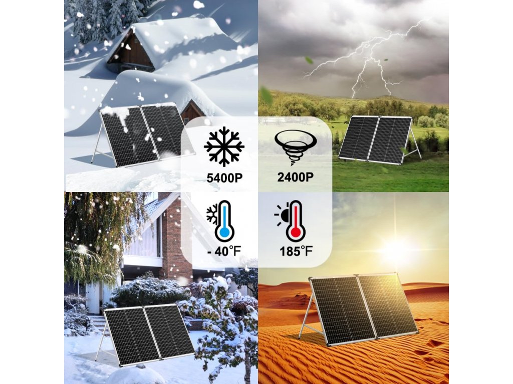 ● Tento solární panel je vyroben z hliníkové slitiny a tvrzeného solárního skla s certifikací pro vysoké zatížení sněhem a větrem, což zaručuje jeho odolnost v extrémních podmínkách.