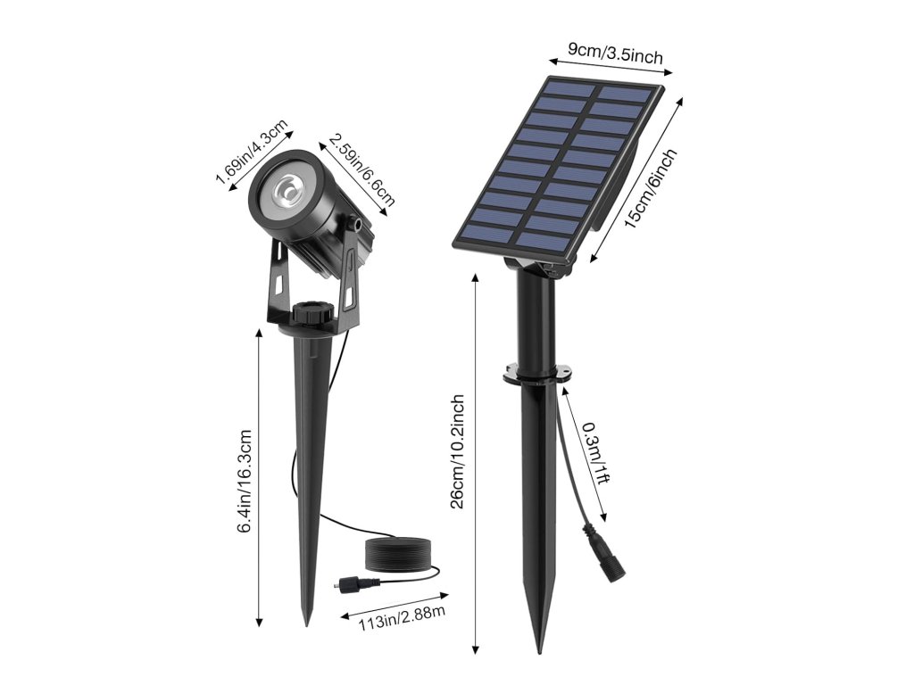 Dvě možnosti montáže: Zapichovací hrot nebo montáž na zeď. S dvěma šrouby můžete solární panel upevnit na zeď nebo snadno zasunout tyč do země. Žádné dráty, žádný stres. Montáž je velmi jednoduchá. Kromě toho poskytujeme dva kolíky na světla, které můžete použít k upevnění světel nebo jednoduše umístit světlo na zem.